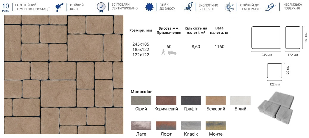 Высота 60 мм: Обладает высокой прочностью — идеально подходит для пешеходных дорожек, террас и зон с возможностью заезда легковых автомобилей.