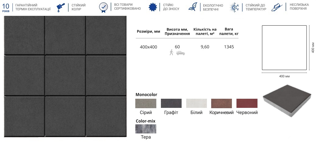 Розмір: 400х400 мм — великі плити створюють ефект стабільного та «спокійного» покриття.