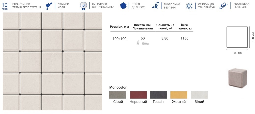 Тротуарна плитка «Квадрат» від ТМ Brukland у малому форматі 100х100 мм — це максимально деталізований та гнучкий інструмент для благоустрою, що нагадує класичну бруківку.